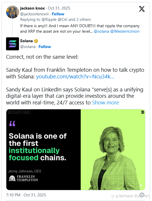 His message directly mentioned Solana and Western Union, suggesting Ripple and XRP hold higher institutional credibility. The comment quickly gained traction and reignited the XRP vs. Solana debate across crypto forums.